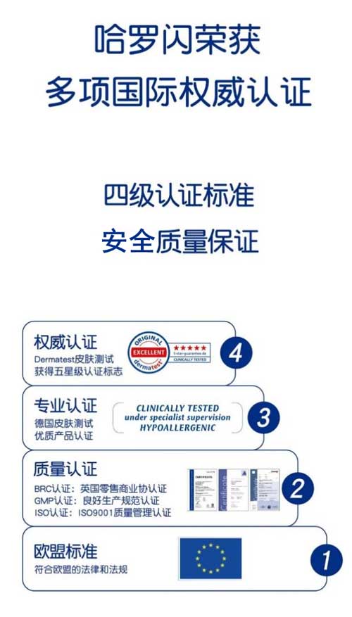 哈羅閃的產(chǎn)品研發(fā)、生產(chǎn)均符合歐盟標準,并擁有德國皮膚測試的優(yōu)質產(chǎn)品認證;如,哈羅閃嬰兒凈護二合一洗發(fā)沐浴露、哈羅閃嬰兒柔護潤膚乳、哈羅閃嬰兒柔護按摩油、哈羅閃嬰兒溫和護膚霜等,均通過了德國權威皮膚科醫(yī)生協(xié)會認證Dermatest的皮膚測試,并獲得5星級認證,達到5星標準即代表產(chǎn)品通過極為嚴苛的檢測程序。