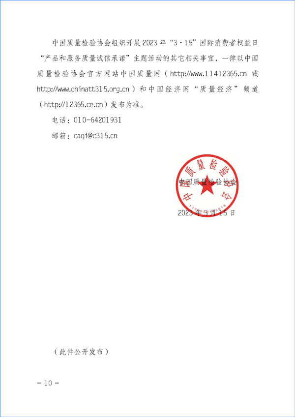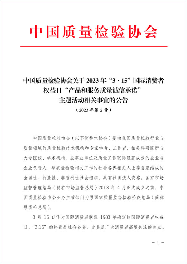 中國質(zhì)量檢驗(yàn)協(xié)會(huì)關(guān)于組織開展2023年“3·15”活動(dòng)的公告(2023年第2號)
