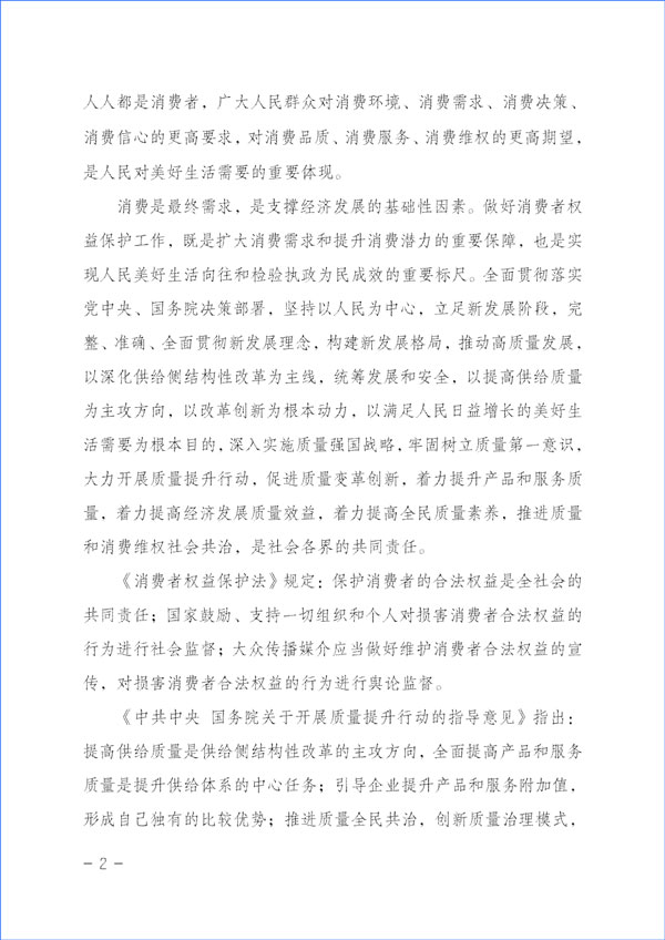 消費(fèi)是最終需求,是支撐經(jīng)濟(jì)發(fā)展的基礎(chǔ)性因素。做好消費(fèi)者權(quán)益保護(hù)工作,既是擴(kuò)大消費(fèi)需求和提升消費(fèi)潛力的重要保障,也是實(shí)現(xiàn)人民美好生活向往和檢驗(yàn)執(zhí)政為民成效的重要標(biāo)尺。全面貫徹落實(shí)黨中央、國務(wù)院決策部署,堅(jiān)持以人民為中心,立足新發(fā)展階段,完整、準(zhǔn)確、全面貫徹新發(fā)展理念,構(gòu)建新發(fā)展格局,推動(dòng)高質(zhì)量發(fā)展,以深化供給側(cè)結(jié)構(gòu)性改革為主線,統(tǒng)籌發(fā)展和安全,以提高供給質(zhì)量為主攻方向,以改革創(chuàng)新為根本動(dòng)力,以滿足人民日益增長的美好生活需要為根本目的,深入實(shí)施質(zhì)量強(qiáng)國戰(zhàn)略,牢固樹立質(zhì)量第一意識,大力開展質(zhì)量提升行動(dòng),促進(jìn)質(zhì)量變革創(chuàng)新,著力提升產(chǎn)品和服務(wù)質(zhì)量,著力提高經(jīng)濟(jì)發(fā)展質(zhì)量效益,著力提高全民質(zhì)量素養(yǎng),推進(jìn)質(zhì)量和消費(fèi)維權(quán)社會(huì)共治,是社會(huì)各界的共同責(zé)任。