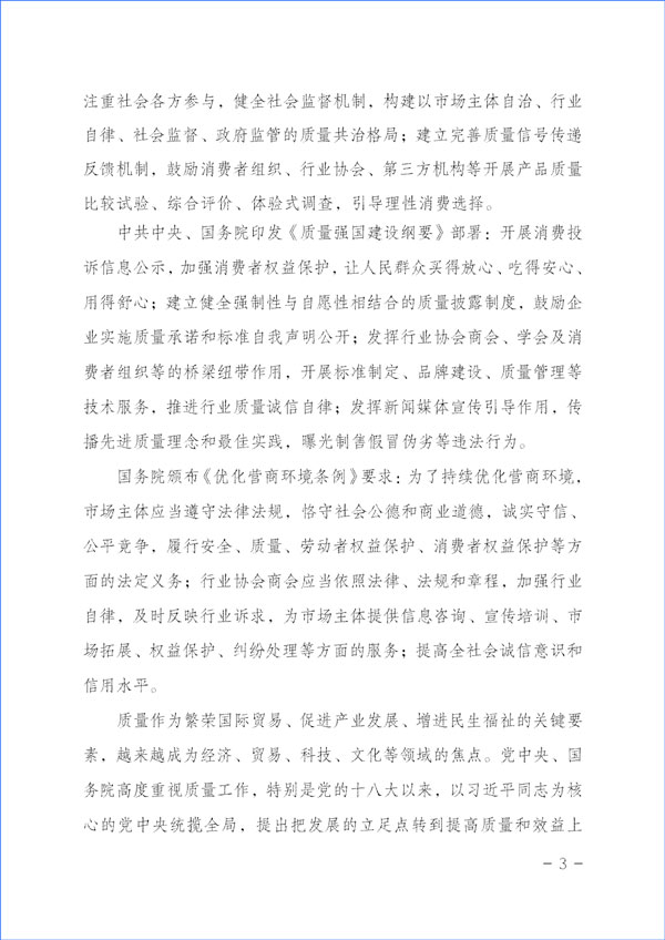 中共中央、國務(wù)院印發(fā)《質(zhì)量強(qiáng)國建設(shè)綱要》部署:開展消費(fèi)投訴信息公示,加強(qiáng)消費(fèi)者權(quán)益保護(hù),讓人民群眾買得放心、吃得安心、用得舒心;建立健全強(qiáng)制性與自愿性相結(jié)合的質(zhì)量披露制度,鼓勵(lì)企業(yè)實(shí)施質(zhì)量承諾和標(biāo)準(zhǔn)自我聲明公開;發(fā)揮行業(yè)協(xié)會(huì)商會(huì)、學(xué)會(huì)及消費(fèi)者組織等的橋梁紐帶作用,開展標(biāo)準(zhǔn)制定、品牌建設(shè)、質(zhì)量管理等技術(shù)服務(wù),推進(jìn)行業(yè)質(zhì)量誠信自律;發(fā)揮新聞媒體宣傳引導(dǎo)作用,傳播先進(jìn)質(zhì)量理念和最佳實(shí)踐,曝光制售假冒偽劣等違法行為。