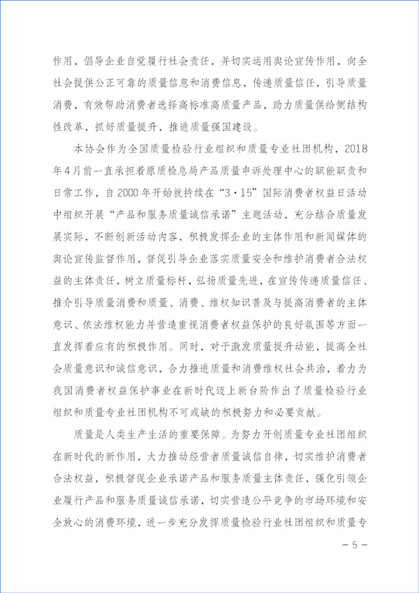 本協(xié)會(huì)作為全國質(zhì)量檢驗(yàn)行業(yè)組織和質(zhì)量專業(yè)社團(tuán)機(jī)構(gòu),2018年4月前一直承擔(dān)著原質(zhì)檢總局產(chǎn)品質(zhì)量申訴處理中心的職能職責(zé)和日常工作,自2000年開始就持續(xù)在“3·15”國際消費(fèi)者權(quán)益日活動(dòng)中組織開展“產(chǎn)品和服務(wù)質(zhì)量誠信承諾”主題活動(dòng),充分結(jié)合質(zhì)量發(fā)展實(shí)際,不斷創(chuàng)新活動(dòng)內(nèi)容,積極發(fā)揮企業(yè)的主體作用和新聞媒體的輿論宣傳監(jiān)督作用,督促引導(dǎo)企業(yè)落實(shí)質(zhì)量安全和維護(hù)消費(fèi)者合法權(quán)益的主體責(zé)任,樹立質(zhì)量標(biāo)桿,弘揚(yáng)質(zhì)量先進(jìn),在宣傳傳遞質(zhì)量信任、推介引導(dǎo)質(zhì)量消費(fèi)和質(zhì)量、消費(fèi)、維權(quán)知識普及與提高消費(fèi)者的主體意識、依法維權(quán)能力并營造重視消費(fèi)者權(quán)益保護(hù)的良好氛圍等方面一直發(fā)揮著應(yīng)有的積極作用。同時(shí),對于激發(fā)質(zhì)量提升動(dòng)能,提高全社會(huì)質(zhì)量意識和誠信意識,合力推進(jìn)質(zhì)量和消費(fèi)維權(quán)社會(huì)共治,著力為我國消費(fèi)者權(quán)益保護(hù)事業(yè)在新時(shí)代邁上新臺(tái)階作出了質(zhì)量檢驗(yàn)行業(yè)組織和質(zhì)量專業(yè)社團(tuán)機(jī)構(gòu)不可或缺的積極努力和必要貢獻(xiàn)。