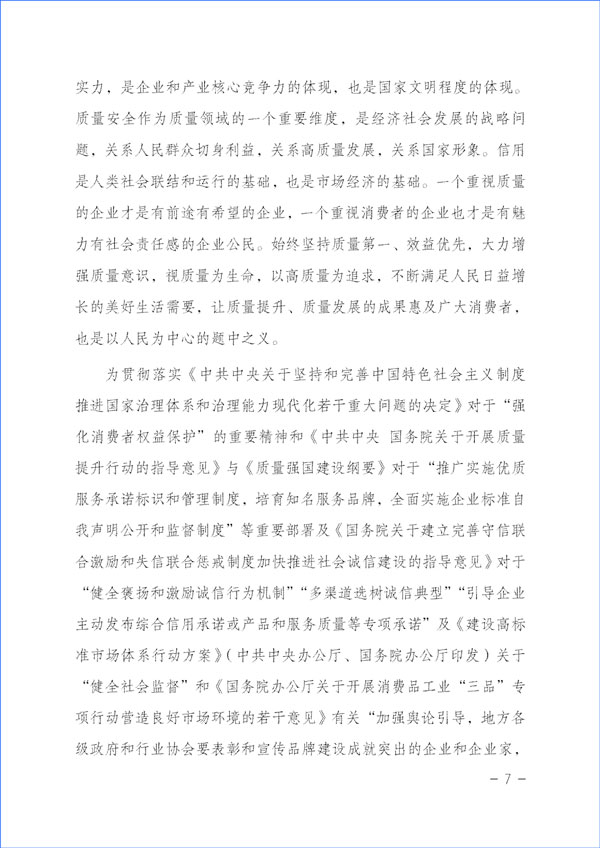 質(zhì)量興則經(jīng)濟(jì)興,質(zhì)量強(qiáng)則國家強(qiáng)。質(zhì)量反映一個(gè)國家的綜合實(shí)力,是企業(yè)和產(chǎn)業(yè)核心競爭力的體現(xiàn),也是國家文明程度的體現(xiàn)。質(zhì)量安全作為質(zhì)量領(lǐng)域的一個(gè)重要維度,是經(jīng)濟(jì)社會(huì)發(fā)展的戰(zhàn)略問題,關(guān)系人民群眾切身利益,關(guān)系高質(zhì)量發(fā)展,關(guān)系國家形象。信用是人類社會(huì)聯(lián)結(jié)和運(yùn)行的基礎(chǔ),也是市場經(jīng)濟(jì)的基礎(chǔ)。一個(gè)重視質(zhì)量的企業(yè)才是有前途有希望的企業(yè),一個(gè)重視消費(fèi)者的企業(yè)也才是有魅力有社會(huì)責(zé)任感的企業(yè)公民。始終堅(jiān)持質(zhì)量第一、效益優(yōu)先,大力增強(qiáng)質(zhì)量意識,視質(zhì)量為生命,以高質(zhì)量為追求,不斷滿足人民日益增長的美好生活需要,讓質(zhì)量提升、質(zhì)量發(fā)展的成果惠及廣大消費(fèi)者,也是以人民為中心的題中之義。