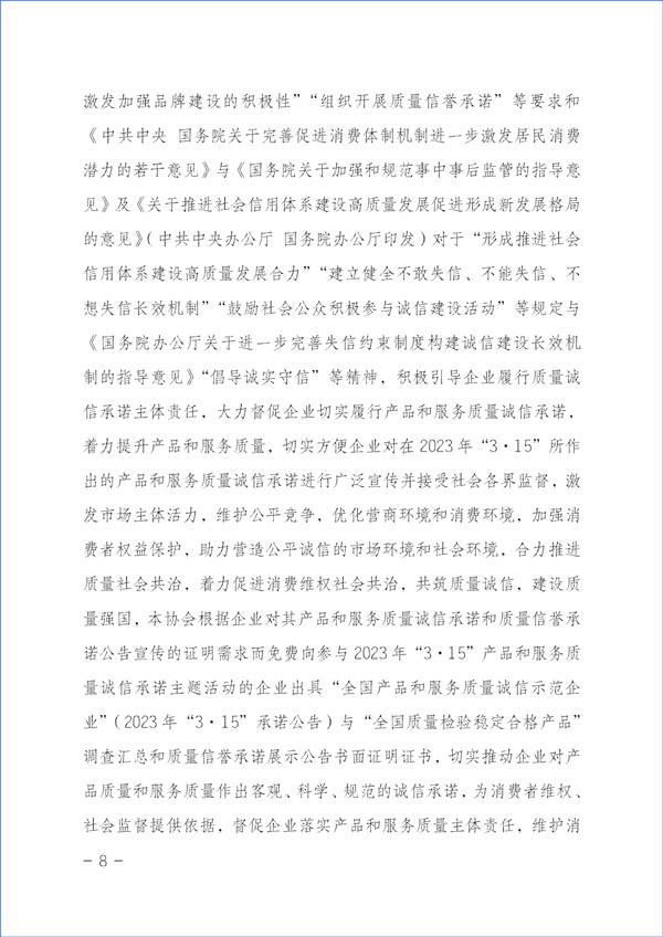 為貫徹落實(shí)《中共中央關(guān)于堅(jiān)持和完善中國特色社會(huì)主義制度 推進(jìn)國家治理體系和治理能力現(xiàn)代化若干重大問題的決定》對于“強(qiáng)化消費(fèi)者權(quán)益保護(hù)”的重要精神和《中共中央 國務(wù)院關(guān)于開展質(zhì)量提升行動(dòng)的指導(dǎo)意見》與《質(zhì)量強(qiáng)國建設(shè)綱要》對于“推廣實(shí)施優(yōu)質(zhì)服務(wù)承諾標(biāo)識和管理制度,培育知名服務(wù)品牌,全面實(shí)施企業(yè)標(biāo)準(zhǔn)自我聲明公開和監(jiān)督制度”等重要部署及《國務(wù)院關(guān)于建立完善守信聯(lián)合激勵(lì)和失信聯(lián)合懲戒制度加快推進(jìn)社會(huì)誠信建設(shè)的指導(dǎo)意見》對于“健全褒揚(yáng)和激勵(lì)誠信行為機(jī)制”“多渠道選樹誠信典型”“引導(dǎo)企業(yè)主動(dòng)發(fā)布綜合信用承諾或產(chǎn)品和服務(wù)質(zhì)量等專項(xiàng)承諾”及《建設(shè)高標(biāo)準(zhǔn)市場體系行動(dòng)方案》(中共中央辦公廳、國務(wù)院辦公廳印發(fā))關(guān)于“健全社會(huì)監(jiān)督”和《國務(wù)院辦公廳關(guān)于開展消費(fèi)品工業(yè)“三品”專項(xiàng)行動(dòng)營造良好市場環(huán)境的若干意見》有關(guān)“加強(qiáng)輿論引導(dǎo),地方各級政府和行業(yè)協(xié)會(huì)要表彰和宣傳品牌建設(shè)成就突出的企業(yè)和企業(yè)家,激發(fā)加強(qiáng)品牌建設(shè)的積極性”“組織開展質(zhì)量信譽(yù)承諾”等要求和《中共中央 國務(wù)院關(guān)于完善促進(jìn)消費(fèi)體制機(jī)制進(jìn)一步激發(fā)居民消費(fèi)潛力的若干意見》與《國務(wù)院關(guān)于加強(qiáng)和規(guī)范事中事后監(jiān)管的指導(dǎo)意見》及《關(guān)于推進(jìn)社會(huì)信用體系建設(shè)高質(zhì)量發(fā)展促進(jìn)形成新發(fā)展格局的意見》(中共中央辦公廳 國務(wù)院辦公廳印發(fā))對于“形成推進(jìn)社會(huì)信用體系建設(shè)高質(zhì)量發(fā)展合力”“建立健全不敢失信、不能失信、不想失信長效機(jī)制”“鼓勵(lì)社會(huì)公眾積極參與誠信建設(shè)活動(dòng)”等規(guī)定與《國務(wù)院辦公廳關(guān)于進(jìn)一步完善失信約束制度構(gòu)建誠信建設(shè)長效機(jī)制的指導(dǎo)意見》“倡導(dǎo)誠實(shí)守信”等精神,積極引導(dǎo)企業(yè)履行質(zhì)量誠信承諾主體責(zé)任,大力督促企業(yè)切實(shí)履行產(chǎn)品和服務(wù)質(zhì)量誠信承諾,著力提升產(chǎn)品和服務(wù)質(zhì)量,切實(shí)方便企業(yè)對在2023年“3·15”所作出的產(chǎn)品和服務(wù)質(zhì)量誠信承諾進(jìn)行廣泛宣傳并接受社會(huì)各界監(jiān)督,激發(fā)市場主體活力,維護(hù)公平競爭,優(yōu)化營商環(huán)境和消費(fèi)環(huán)境,加強(qiáng)消費(fèi)者權(quán)益保護(hù),助力營造公平誠信的市場環(huán)境和社會(huì)環(huán)境,合力推進(jìn)質(zhì)量社會(huì)共治,著力促進(jìn)消費(fèi)維權(quán)社會(huì)共治,共筑質(zhì)量誠信,建設(shè)質(zhì)量強(qiáng)國,本協(xié)會(huì)根據(jù)企業(yè)對其產(chǎn)品和服務(wù)質(zhì)量誠信承諾和質(zhì)量信譽(yù)承諾公告宣傳的證明需求而免費(fèi)向參與2023年“3·15”產(chǎn)品和服務(wù)質(zhì)量誠信承諾主題活動(dòng)的企業(yè)出具“全國產(chǎn)品和服務(wù)質(zhì)量誠信示范企業(yè)”(2023年“3·15”承諾公告)與“全國質(zhì)量檢驗(yàn)穩(wěn)定合格產(chǎn)品”調(diào)查匯總和質(zhì)量信譽(yù)承諾展示公告書面證明證書,切實(shí)推動(dòng)企業(yè)對產(chǎn)品質(zhì)量和服務(wù)質(zhì)量作出客觀、科學(xué)、規(guī)范的誠信承諾,為消費(fèi)者維權(quán)、社會(huì)監(jiān)督提供依據(jù),督促企業(yè)落實(shí)產(chǎn)品和服務(wù)質(zhì)量主體責(zé)任,維護(hù)消費(fèi)者合法權(quán)益,不斷增強(qiáng)人民群眾對質(zhì)量的獲得感、幸福感、安全感。本協(xié)會(huì)在本次活動(dòng)中向企業(yè)所出具的書面證明證書,謹(jǐn)系企業(yè)公開發(fā)布產(chǎn)品和服務(wù)質(zhì)量專項(xiàng)承諾與企業(yè)主動(dòng)公告質(zhì)量信譽(yù)情況的公告證明,不涉及評比或評價(jià)、排序。