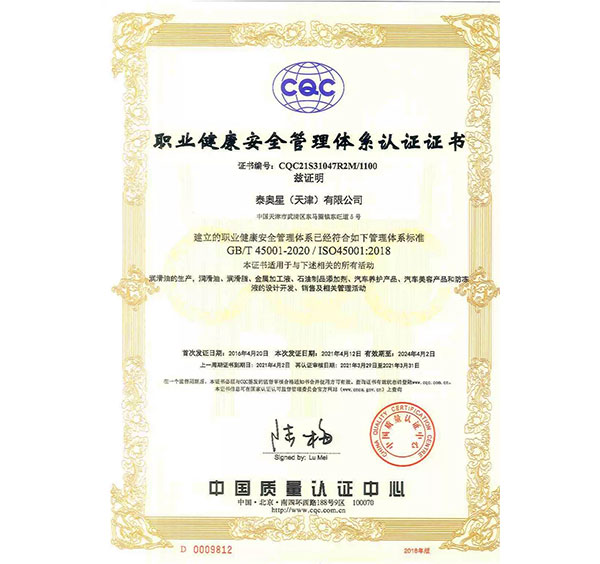 多年來,泰奧星堅(jiān)持質(zhì)量至上的經(jīng)營理念,先后通過了ISO9001質(zhì)量管理體系、ISO14001環(huán)境管理體系和、OHSAS18001職業(yè)健康安全管理體系及IATF16949質(zhì)量管理體系四大體系認(rèn)證。嚴(yán)格的質(zhì)量控制體系保障了公司產(chǎn)品質(zhì)量穩(wěn)定優(yōu)良,近年來,泰奧星先后被認(rèn)定為CMMC中國潤滑材料行業(yè)十強(qiáng)、全國潤滑十佳企業(yè)、中國綠色低碳先鋒企業(yè)等。
