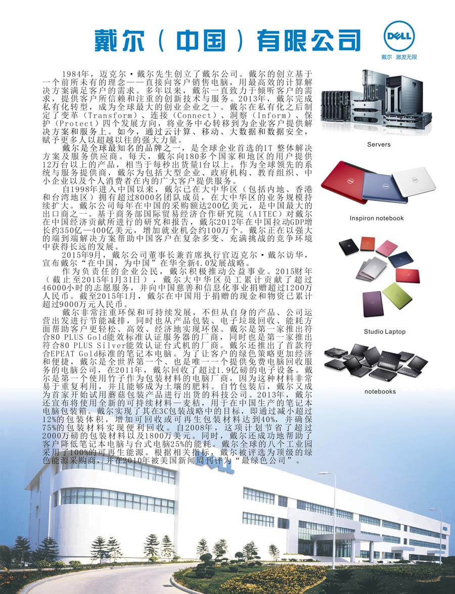 1984年,邁克爾•戴爾先生創(chuàng)立了戴爾公司。戴爾公司的創(chuàng)立基于一個前所未有的理念——直接向客戶銷售電腦,用高效的計算解決方案滿足客戶的需求。多年以來,戴爾一直致力于傾聽客戶的需求,提供客戶所信賴和注重的創(chuàng)新技術(shù)與服務(wù)。