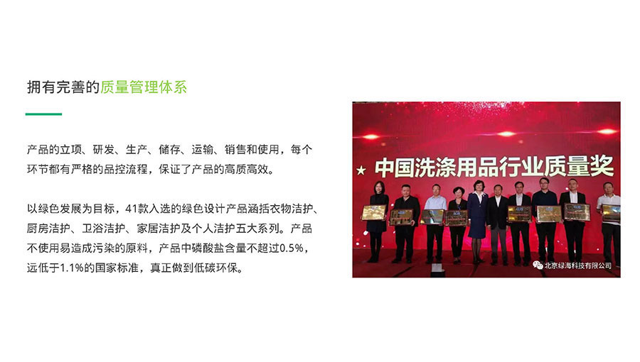 2018年11月,以綠色發(fā)展為目標的41款綠傘產(chǎn)品入選綠色設(shè)計產(chǎn)品。這些產(chǎn)品均不使用易造成污染的原料,磷酸鹽含量不超過0.5%,遠低于1.1%的國家標準,真正做到低碳環(huán)保。同年,綠傘榮獲中國洗滌用品工業(yè)協(xié)會頒發(fā)的“中國洗滌用品行業(yè)質(zhì)量獎”,這一獎項的頒發(fā)充分肯定了綠傘一直以來嚴把質(zhì)量關(guān)、綠色環(huán)保的發(fā)展戰(zhàn)略。