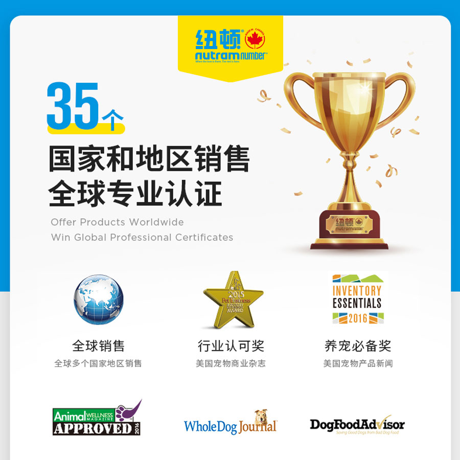 Nutram紐頓源自加拿大百年工廠,擁有超25年寵物食品制造經(jīng)驗(yàn),旗下產(chǎn)品遠(yuǎn)銷全球超35個(gè)國家及地區(qū),深受消費(fèi)者喜愛,是美國WDJ雜志連續(xù)多年推薦品牌,美國DFA五星推薦品牌,被美國寵物產(chǎn)品新聞授予“養(yǎng)寵必備獎(jiǎng)”。