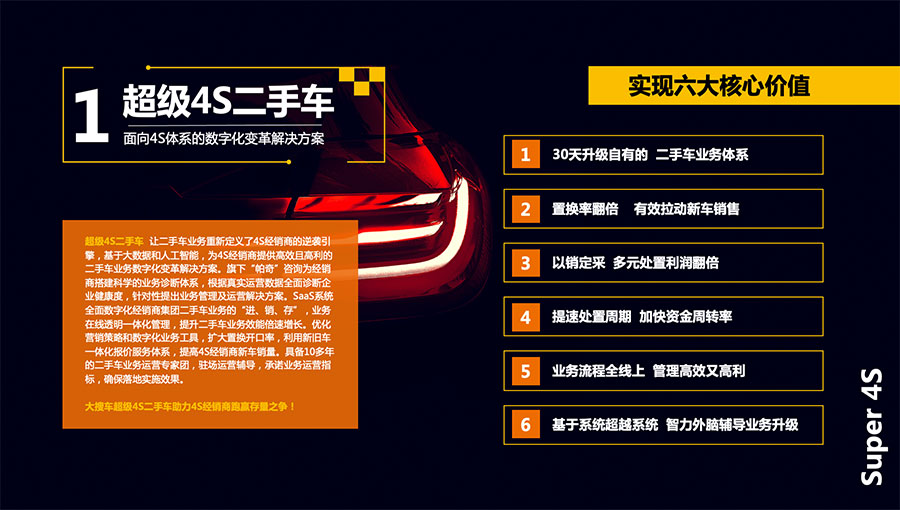 車易拍聚合大搜車的SaaS服務能力和車易拍的在線拍賣交易能力,搭建了以拍賣交易為核心的二手車數(shù)字化供應鏈服務平臺,為二手車買家、賣家、檢測服務商、車務服務商等各個生態(tài)伙伴提供基于SaaS產(chǎn)品的業(yè)務數(shù)字化變革解決方案。拍賣生態(tài)伙伴基于SaaS產(chǎn)品實現(xiàn)業(yè)務在線和數(shù)據(jù)協(xié)同,形成行業(yè)聚合的數(shù)據(jù)共享和社會化服務能力共享,共同打造高效的二手車在線交易能力及服務體系。