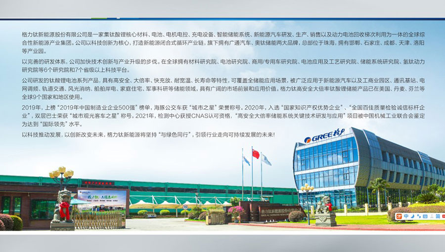 格力鈦新能源股份有限公司是一家集鈦酸鋰核心材料、電池、電機(jī)電控、充電設(shè)備、智能儲(chǔ)能系統(tǒng)、新能源汽車(chē)研發(fā)、生產(chǎn)、銷(xiāo)售以及動(dòng)力電池回收梯次利用為一體的全球綜合性新能源產(chǎn)業(yè)集團(tuán)。格力鈦新能源以科技創(chuàng)新為核心,打造新能源閉合式循環(huán)產(chǎn)業(yè)鏈,旗下?lián)碛袕V通汽車(chē)、奧鈦儲(chǔ)能兩大品牌,總部位于珠海,擁有邯鄲、石家莊、成都、天津、洛陽(yáng)等產(chǎn)業(yè)園。