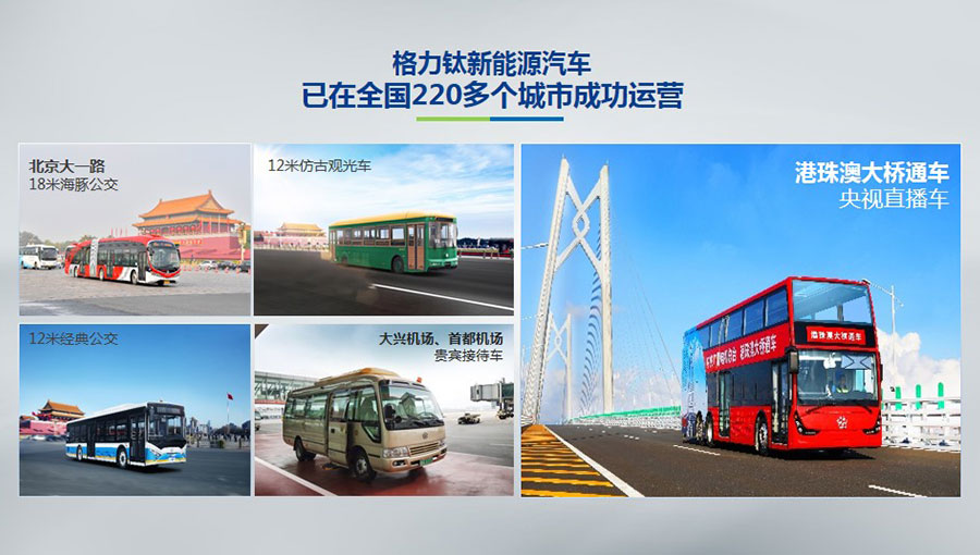 目前,格力鈦生產(chǎn)的新能源汽車(chē)于北京、杭州、武漢、青島、哈爾濱、包頭、海口等全國(guó)220多個(gè)城市運(yùn)營(yíng)。2014年,仿古鐺鐺車(chē)榮膺第22屆北京APEC會(huì)議官方指定用車(chē)、登陸北京環(huán)天安門(mén)旅游觀光線。2016年,雙層巴士榮膺第二屆中美低碳峰會(huì)指定用車(chē)、登陸國(guó)內(nèi)首條純電動(dòng)雙層觀光車(chē)線路——北京城市旅游觀光3線。2017年,18米海豚公交車(chē)投入北京長(zhǎng)安街1路運(yùn)營(yíng)。2018年,港珠澳大橋正式通車(chē),雙層巴士擔(dān)綱中央廣播電視總臺(tái)直播車(chē),成為首輛駛上港珠澳大橋的大巴車(chē)。
