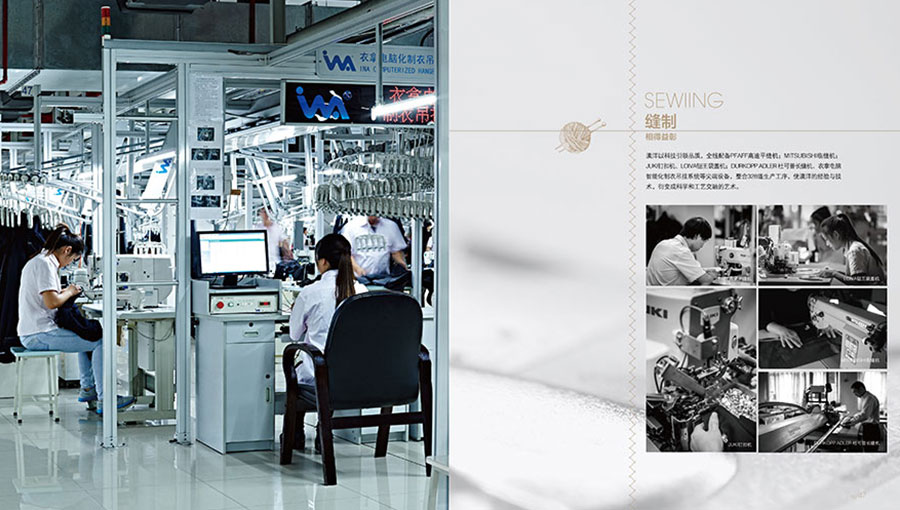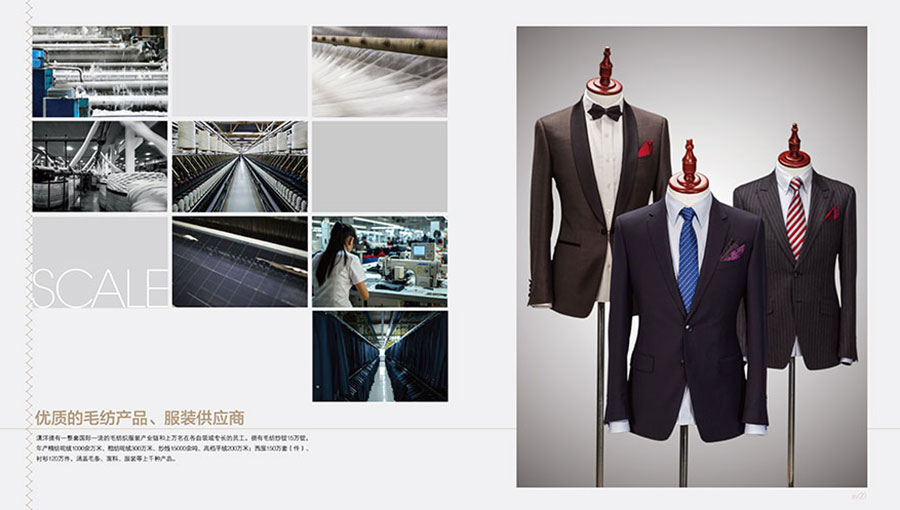 公司具備年生產(chǎn)粗精紡呢絨1000萬(wàn)米,經(jīng)營(yíng)規(guī)模在全國(guó)毛紡織行業(yè)中居前五強(qiáng)。服裝制造:在服裝制造領(lǐng)域,澳洋集團(tuán)擁有自主品牌“澳洋”和“沃爾芬”,生產(chǎn)西服、西褲、襯衫、夾克、防寒服、毛衣、工裝等全系列產(chǎn)品,年產(chǎn)中高檔職業(yè)裝150萬(wàn)套、襯衫120萬(wàn)件。澳洋服裝廠擁有國(guó)際最為先進(jìn)的美國(guó)“格柏”CAD設(shè)計(jì)系統(tǒng)及自動(dòng)裁床、德國(guó)“杜克普”、美國(guó)“格柏”和日本重機(jī)專業(yè)縫制設(shè)備、意大利全套“邁埤”整燙系統(tǒng)、加拿大“衣拿”、德國(guó)“百福”智能吊掛系統(tǒng)等。精紡廠的生產(chǎn)設(shè)備從條染、紡紗、織造、后整理和檢驗(yàn)檢測(cè)設(shè)備95%從德國(guó)、意大利和日本進(jìn)口。公司已發(fā)展成為國(guó)內(nèi)技術(shù)裝備最先進(jìn)、生產(chǎn)工藝最完善的精品職業(yè)服裝和面料生產(chǎn)基地。