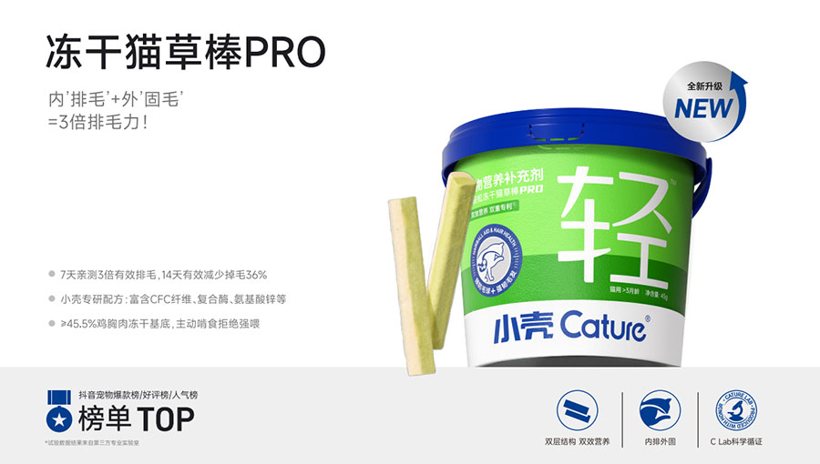 主要產(chǎn)品:小殼絕育定制糧,小殼皮膚毛發(fā)定制糧,小殼免疫呵護(hù)定制糧,小殼功能主食罐系列(小殼排毛主食罐,小殼魚(yú)油主食罐),小殼小輕松凍干棒系列(小殼貓草棒pro,小殼魚(yú)油棒pro)