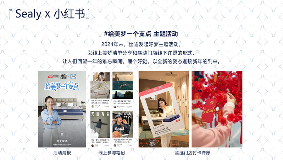 2024年末,絲漣發(fā)起好夢主題活動,以線上美夢清單分享和絲漣門店線下許愿的形式,讓人們回望一年的難忘瞬間,睡個好覺,以全新的姿態(tài)迎接新年的到來。