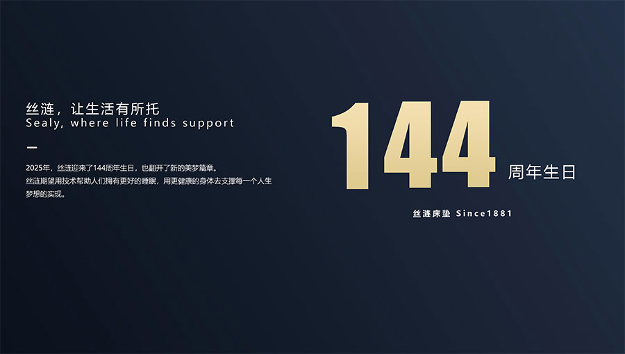 絲漣SEALY1881年誕生于美國,自1885年第一張絲漣床墊問世伊始,便憑借其卓越性能與舒適安睡體驗聲名大噪。1950年,絲漣開創(chuàng)床墊與醫(yī)學權(quán)威共研的先河,絲漣美姿以科學的脊柱支撐理念徹底重塑了床墊行業(yè)。75年來,持續(xù)的技術(shù)升級和創(chuàng)新使得美姿彈簧不斷進化,只為打造更加舒適健康的睡眠體驗。