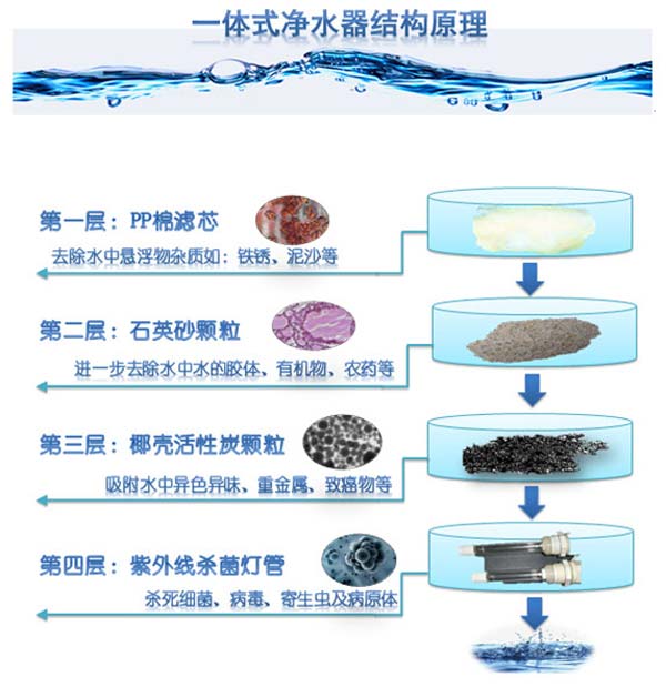 鄧凈公司主打產(chǎn)品,鄧凈牌凈水機YCZ-QT8-DJ01。鄧凈凈水機YCZ-QT8-DJ01以生物慢濾為原型,采用純物理凈化原理和漸進式結(jié)構(gòu)即纖維素濾芯+石英石+活性炭+紫外線消毒四級過濾,通過截留、沉降、吸附和殺菌等作用,有效地凈化水源,改善飲用水安全。