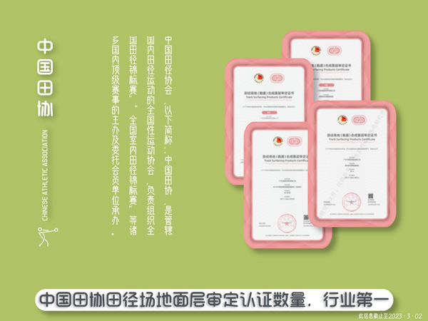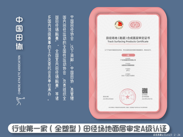 杰銳體育獲全塑型田協(xié)審定A級(jí);面層審定數(shù)量眾多;世界田徑面層系統(tǒng)認(rèn)證數(shù)量國(guó)內(nèi)名列前茅!