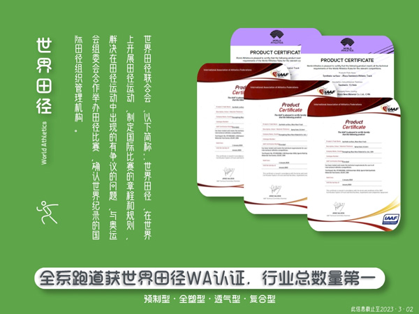 榮獲WA認(rèn)證的運(yùn)動(dòng)地材產(chǎn)品,意味著國(guó)際田聯(lián)的背書(shū)和肯定,在品質(zhì)、使用體驗(yàn)、安全性等諸多方面達(dá)到國(guó)際專(zhuān)業(yè)競(jìng)賽要求。