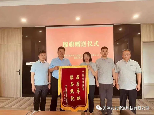 2023年6月,南京清泉城市建設(shè)工程股份有限公司送予天津友發(fā)管道科技有限公司“品質(zhì)卓越 服務(wù)熱忱”的錦旗,對我公司產(chǎn)品質(zhì)量及售后服務(wù)表示認可和感謝。