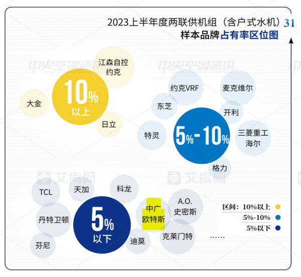 2023上半年,中廣歐特斯在渠道推廣和產品研發(fā)上不斷發(fā)力,兩聯供機組市場開拓取得了一定的成績,并在2023上半年度兩聯供機組(含戶式水機)樣本品牌占有率上展示出一定的表現力,與科龍中央空調、天加、TCL智能暖通等國貨品牌并肩前行,占有率均為5%以下。