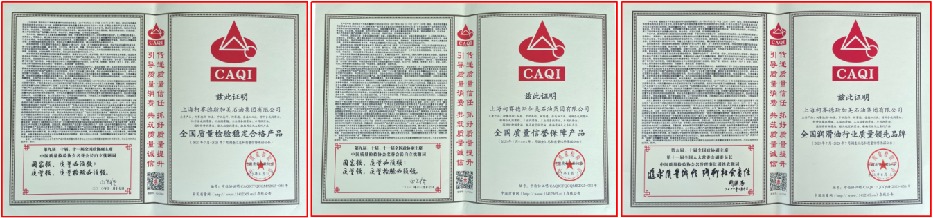 迎接即將到來(lái)的又一個(gè)全國(guó)質(zhì)量月——9月之際,8月11日,中國(guó)質(zhì)量協(xié)會(huì)向上??沦惖滤辜用朗图瘓F(tuán)有限公司頒發(fā)三大榮譽(yù),即全國(guó)質(zhì)量檢驗(yàn)穩(wěn)定合格產(chǎn)品、全國(guó)質(zhì)量信譽(yù)保障產(chǎn)品、全國(guó)潤(rùn)滑油行業(yè)質(zhì)量領(lǐng)先品牌。這是在新的市場(chǎng)形勢(shì)下,柯賽德斯加美石油集團(tuán)深耕能源,堅(jiān)持質(zhì)量振興企業(yè)、科技助推發(fā)展、誠(chéng)信塑造品牌戰(zhàn)略的長(zhǎng)期努力結(jié)出的碩果。