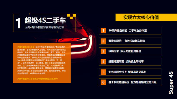 多年來,268V檢測系統(tǒng)已經(jīng)在全國經(jīng)銷商中普及,累計檢測數(shù)百萬車輛。如今,該系統(tǒng)進(jìn)一步融入云計算、人工智能、圖像識別、語音識別等先進(jìn)技術(shù),可以實現(xiàn)全程無人化和更高的檢測效率與精準(zhǔn)度。在此基礎(chǔ)上,車易拍聚合大搜車的SaaS能力和自身的交易拍賣能力,推出了超級4S二手車這一數(shù)字化變革解決方案,通過對進(jìn)、銷、存、管的全面數(shù)字化,有效推動經(jīng)銷商內(nèi)部工作流程的規(guī)范化和提升運(yùn)營效率。