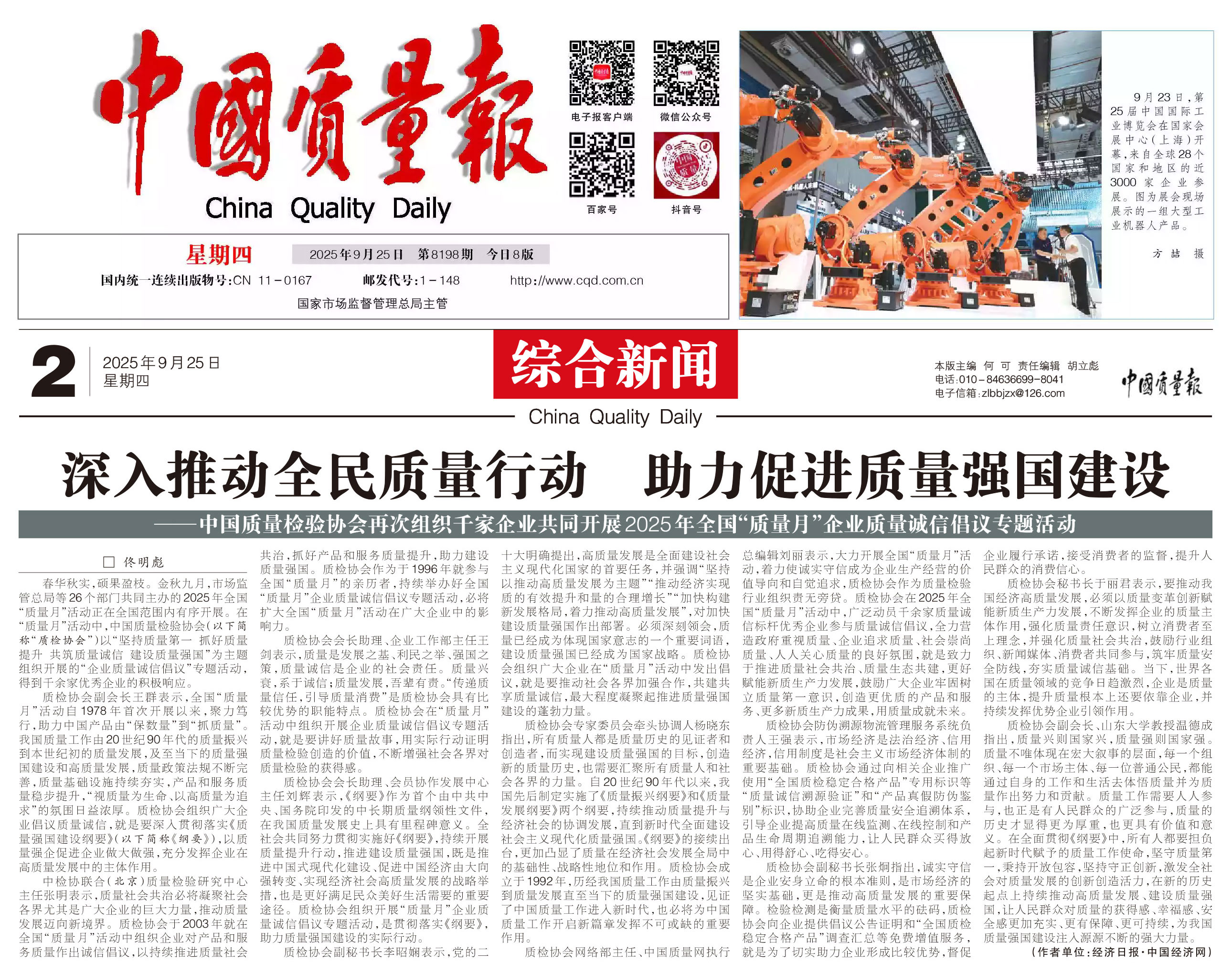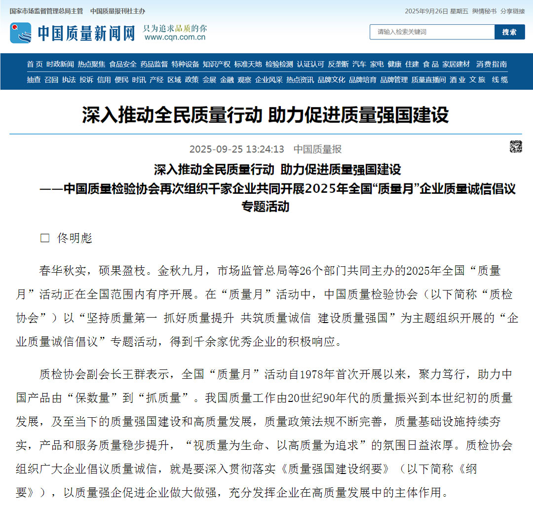 - 《中國(guó)質(zhì)量報(bào)》(2025年9月25日刊)發(fā)布:深入推動(dòng)全民質(zhì)量行動(dòng) 助力促進(jìn)質(zhì)量強(qiáng)國(guó)建設(shè)——中國(guó)質(zhì)量檢驗(yàn)協(xié)會(huì)再次組織千家企業(yè)共同開(kāi)展2025年全國(guó)“質(zhì)量月”企業(yè)質(zhì)量誠(chéng)信倡議專(zhuān)題活動(dòng)