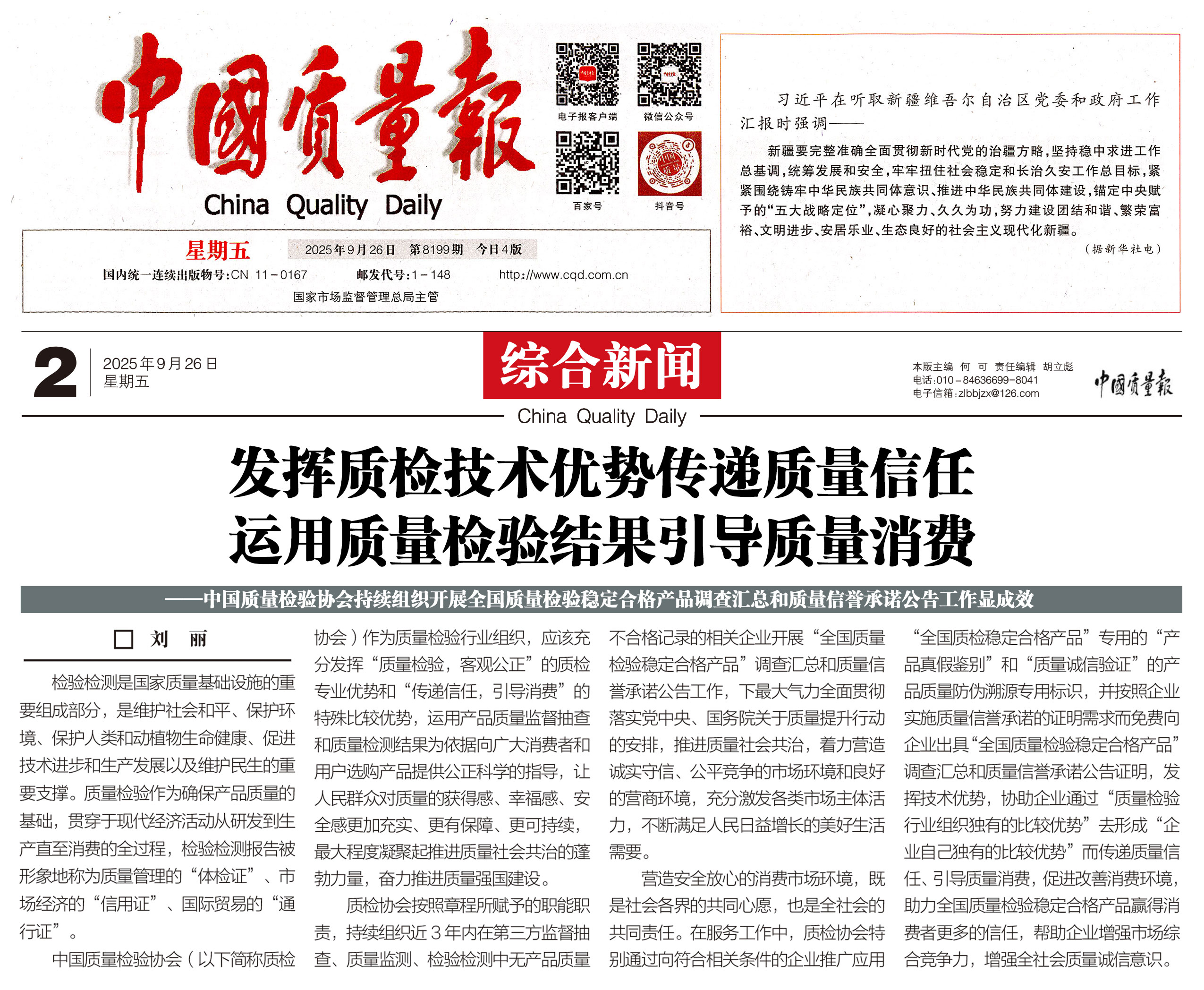 - 《中國(guó)質(zhì)量報(bào)》(2025年9月26日刊)發(fā)布:發(fā)揮技術(shù)優(yōu)勢(shì)傳遞質(zhì)量信任 運(yùn)用質(zhì)檢結(jié)果引導(dǎo)質(zhì)量消費(fèi)————中國(guó)質(zhì)量檢驗(yàn)協(xié)會(huì)持續(xù)組織開(kāi)展全國(guó)質(zhì)量檢驗(yàn)穩(wěn)定合格產(chǎn)品調(diào)查匯總和質(zhì)量信譽(yù)承諾公告工作顯成效